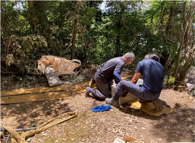 施工前 施工工程 施工後 施工内容 石塔、旧石、外柵、基礎、カロート:解体撤去工事 墓地面積:1.5㎡ 備考 今回の解体工事は夷隅郡大多喜町の小土
